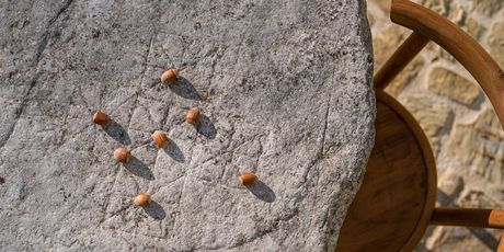 „U prostranom se prizemlju nalaze kuhinja, blagovaonica i djelom dvoetažni dnevni boravak sa otvorenim stubištem. S prednje terase sa starim kamenim stolom, zasjenjene pergolom od jasmina i glicinija, pogled puca na bazen te vinograde i maslinike u pozadini. Bazen je opremljen mlazom za protustrujno plivanje, vanjskim tušem te zasebnom kupaonicom dostupnom izvana. Sjenovita stražnja terasa sa povrtnjakom i začinskim vrtom služi i kao ljetna blagovaonica s pogledom na stari hrast i slikovito mjesto Kostanjicu u daljini.