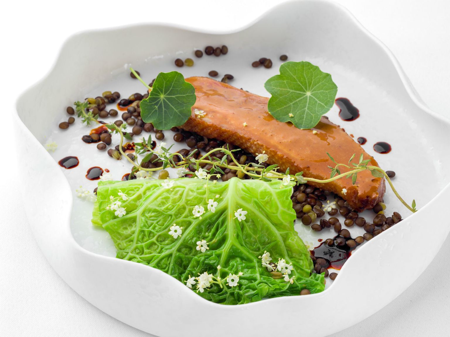 • Confit od pačjeg batka, kelj, pačja prsa, crna leća, umak od anisa Foto: Arhiva hotela Esplanade