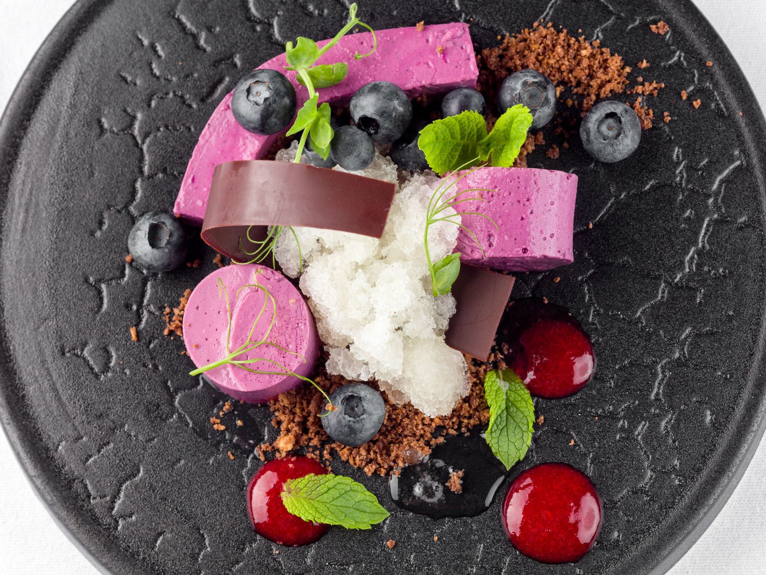 • Crème brûlée od borovnica, snijeg od bazge, gel od borovnica, menta Foto: Arhiva hotela Esplanade