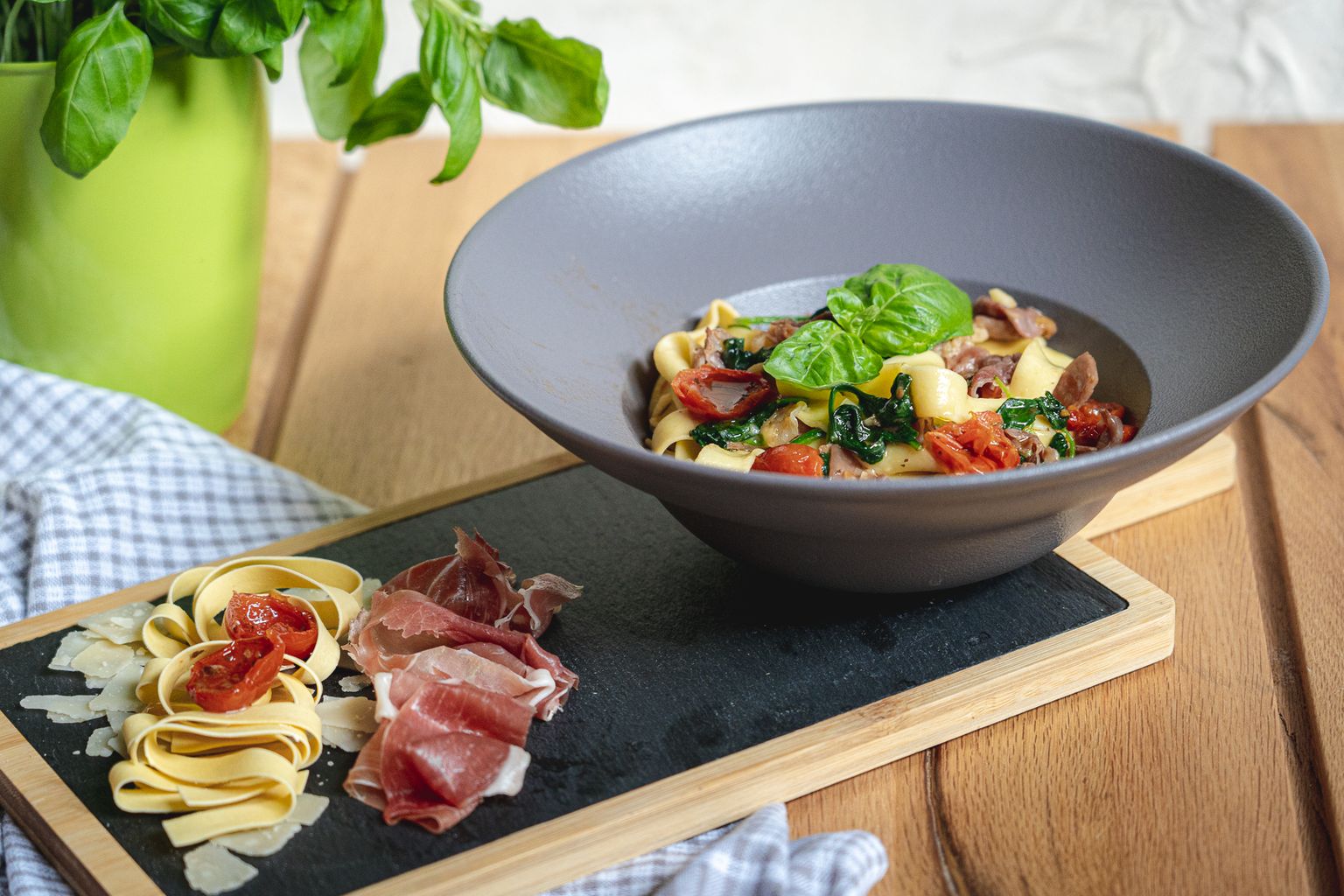 • Tagliatelle s pršutom, sušenim rajčicama i špinatom Foto: Pavao Bobinac/Nova Studio