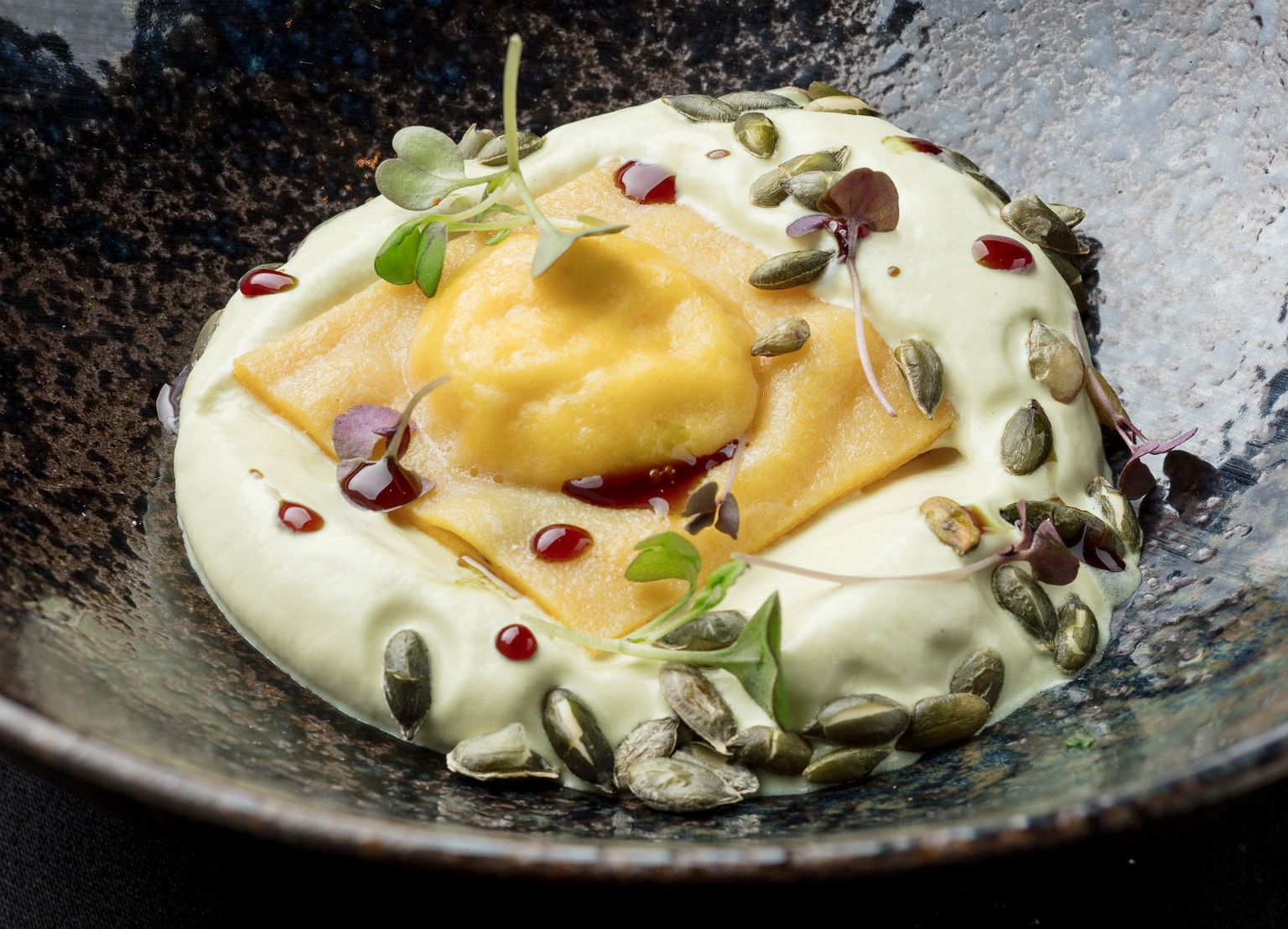 • Ravioli od buče, pjena od bučinog ulja, pržene sjemenke i feta sir Foto: Hotel Esplanade Zagreb