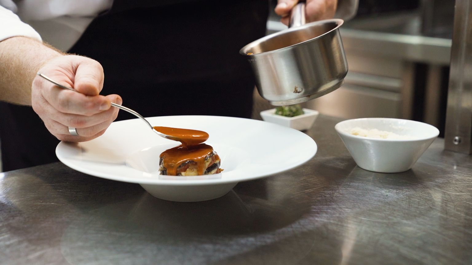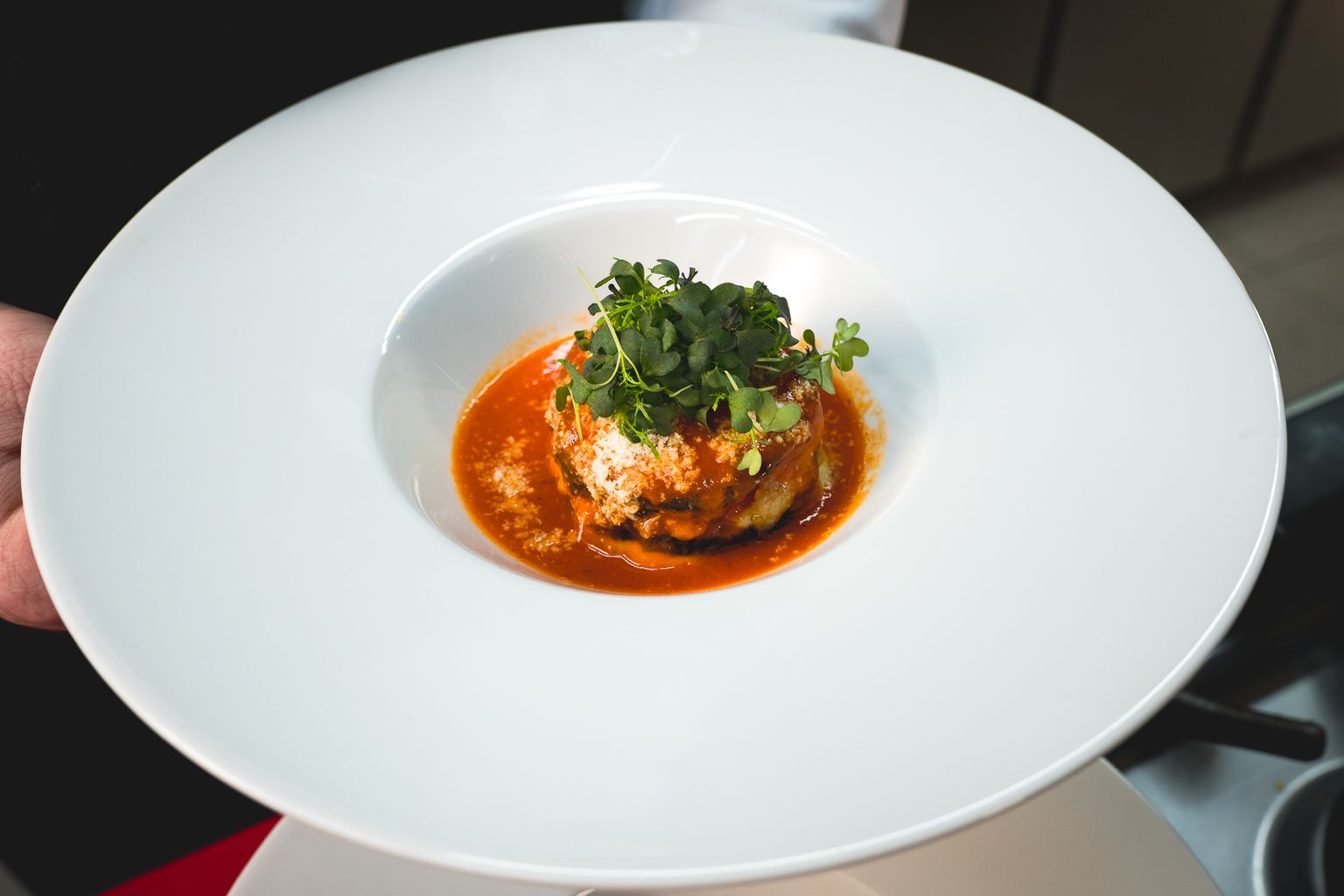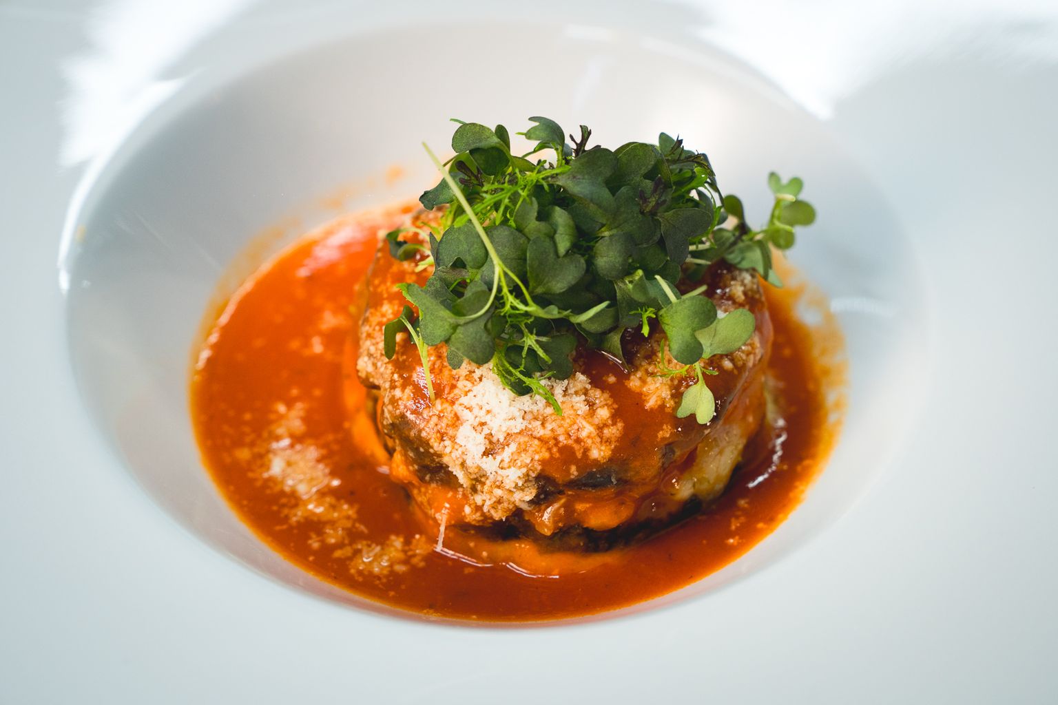 • Melanzane alla parmigiana ukrasite umakom od rajčice, parmezanom i bosiljkom Foto: Sandro Sklepić