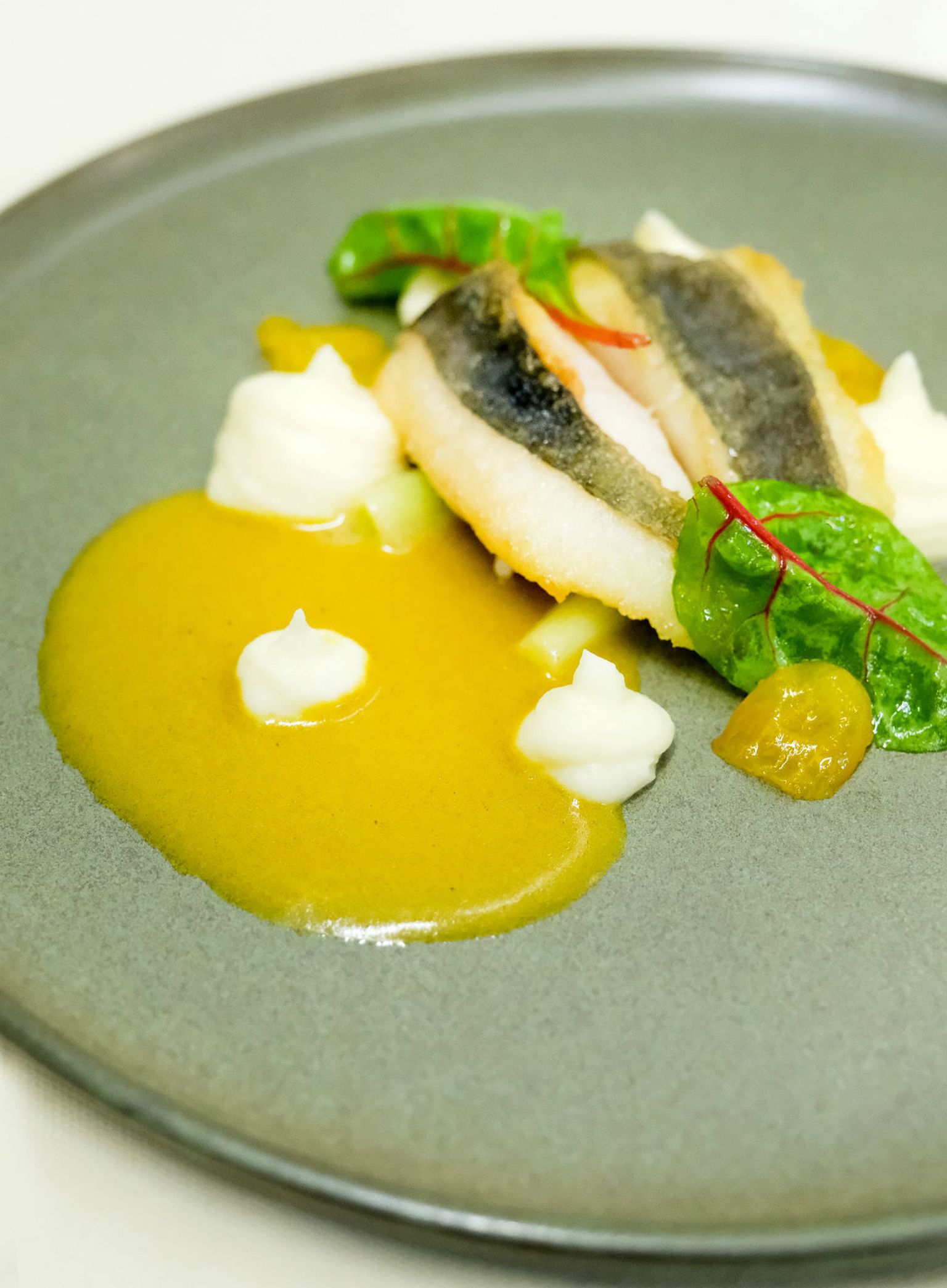 • Pečeni file kovača ribljim velouteom, umakom od kurkume, kremom od pastrnjaka, kumquatom i mladim lukom. Foto: Rajna Raguž Photography
