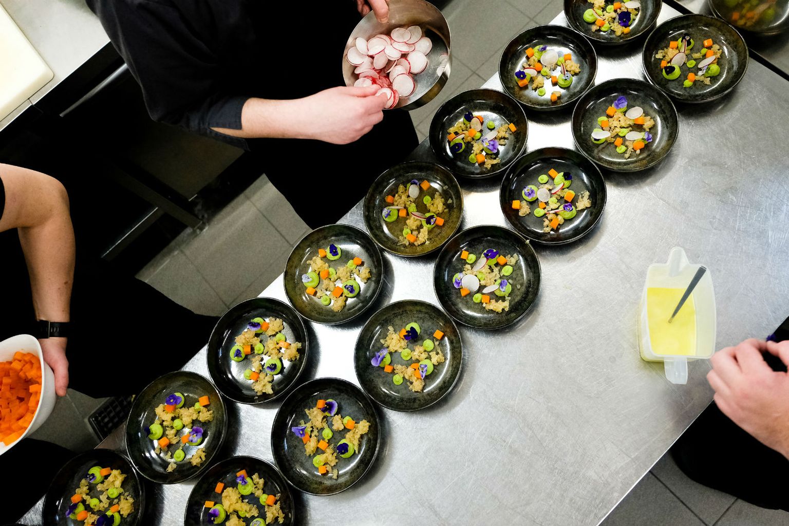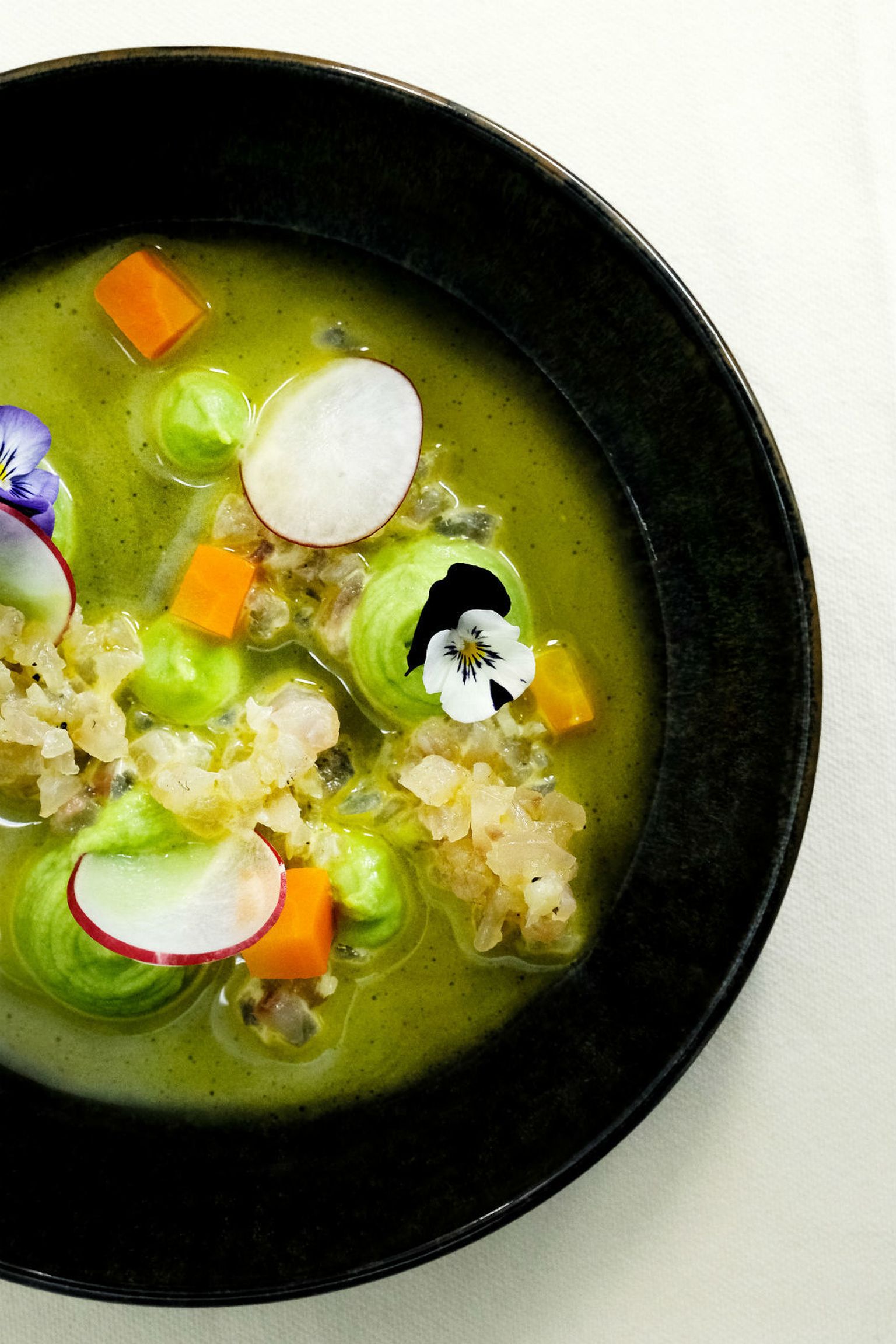 • Ceviche od sušenog brancina s kremom od graška, mrkvom i rotkvicama te s emulzijom od Chiavalon maslinovog ulja i naranče Foto: Rajna Raguž Photography